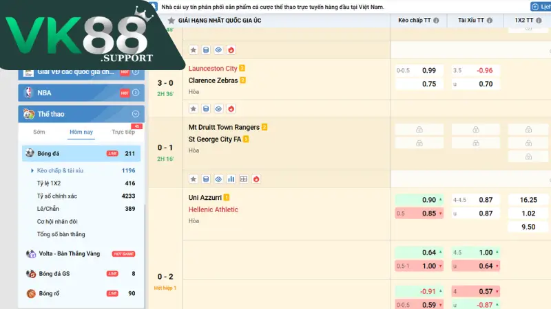 Sảnh cá cược thể thao VK88 đang là nơi lý tưởng để bet thủ trải nghiệm và đầu tư tìm kiếm tiền thưởng. Hàng trăm trận đấu bóng đá, hàng chục tỷ lệ kèo “thơm” đang được cung cấp mỗi ngày. Nhanh tay đến với nhà cái VK88 để cá cược thể thao thôi nào!